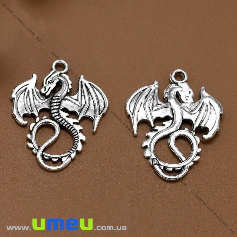 [Архів] Підвіска металева Дракон (двухстро.), Античне срібло, 35х28 мм (POD-028287) / 1 шт