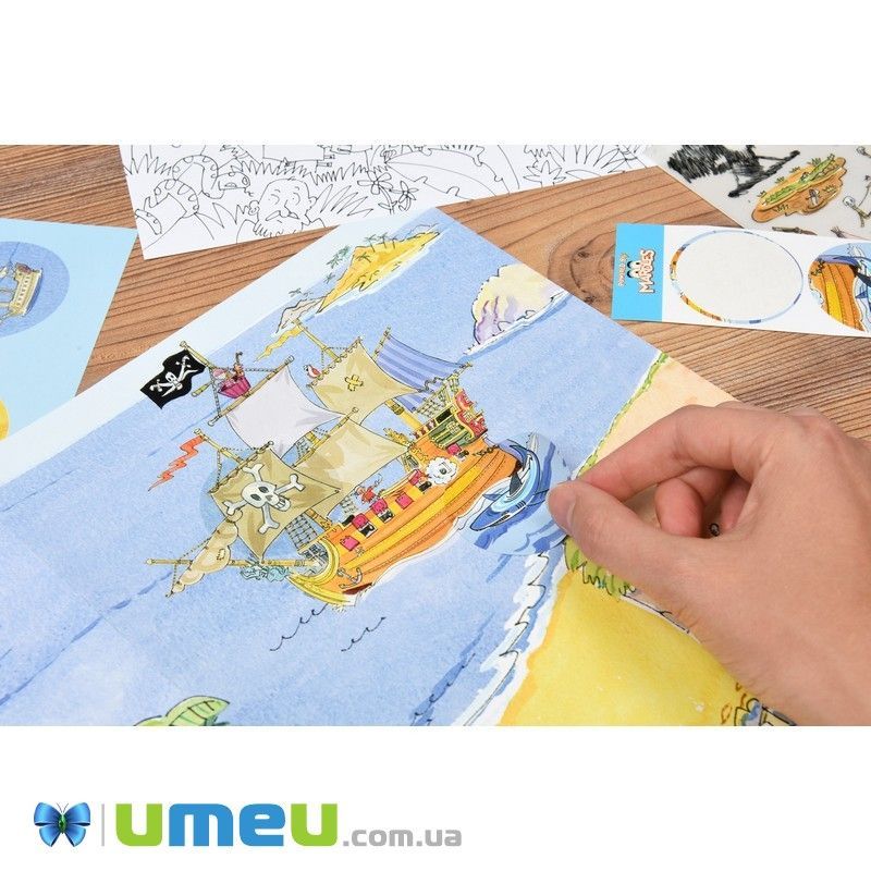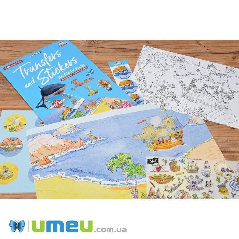 Великий набір перевідних наклейок з тематичним зображенням цілого острова казкових персонажів (дракони, русалки), скринь зі скарбами, піратів, захоплених кораблів.