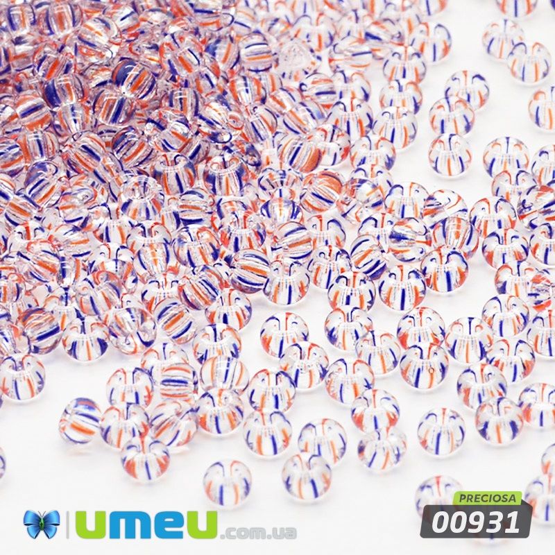 Бісер чеський №894/00931, Прозорий у червоно-синю смужку, 10/0 (BIS-043993) / 1 уп (5 г)