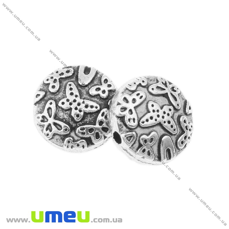[Архів] Намистина мет. кругла плоска з метеликами, 10х5 мм, Античне срібло (BUS-004953) / 1 шт