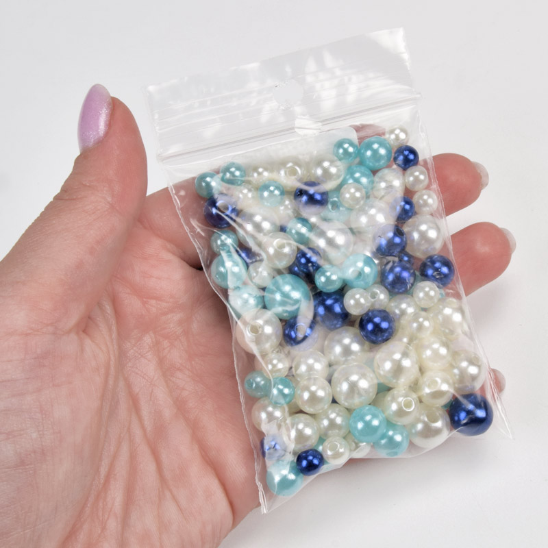 В миксе бусины размером от 6 до 10 мм.Бусины пластиковые Круглые, Жемчуг, 6-10 мм, Микс бело-синий (BUS-059767) / 1 уп (25 г)BUS-05976729.00₴ / уп (25 г) -