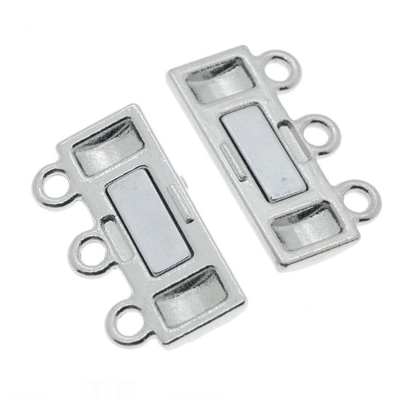 • Магнитный замок – обычно изготовлен в виде цилиндра, бочонка или шарика, состоящих из двух магнитных деталей. На краях расположены петельки, позволяющие прикрепить застежку к изделию. Такими замками оснащают и клеевые концевики для шнуров.