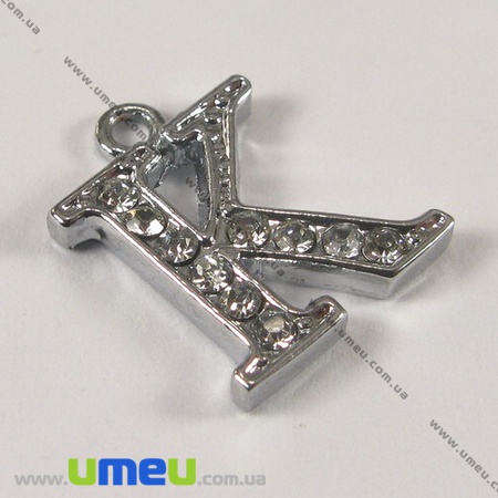 [Архив] Подвеска металлическая Буква со стразами K, Серебро, 15х11 мм (POD-001215) / 1 шт