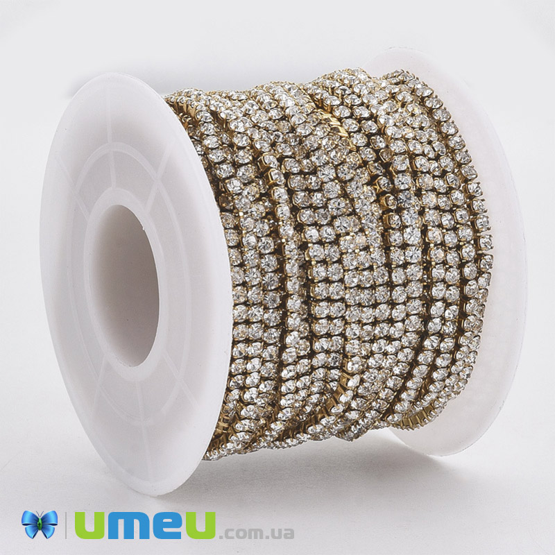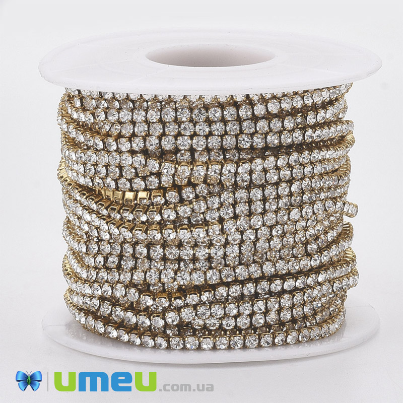 Стразовая цепь SS6 - 2,0 мм, Нерж. сталь золото, Стразы стеклянные белые (ZEP-040486) / 1 м