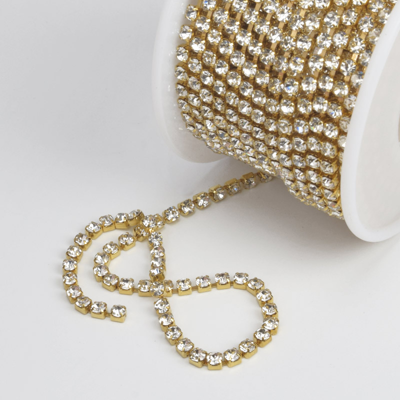 Стразовая цепь SS10 (2,6 мм), Золото, Стразы стеклянные белые (ZEP-047554) / 1 м