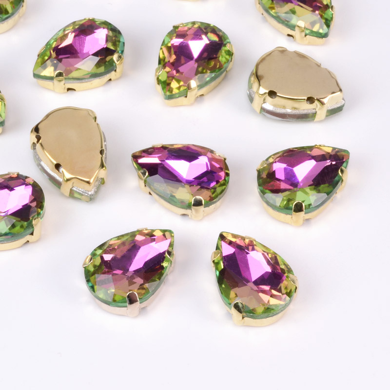 Шатон капля 14х10 мм, Золото, Малиново-изумрудный (KAB-052919) / 1 шт