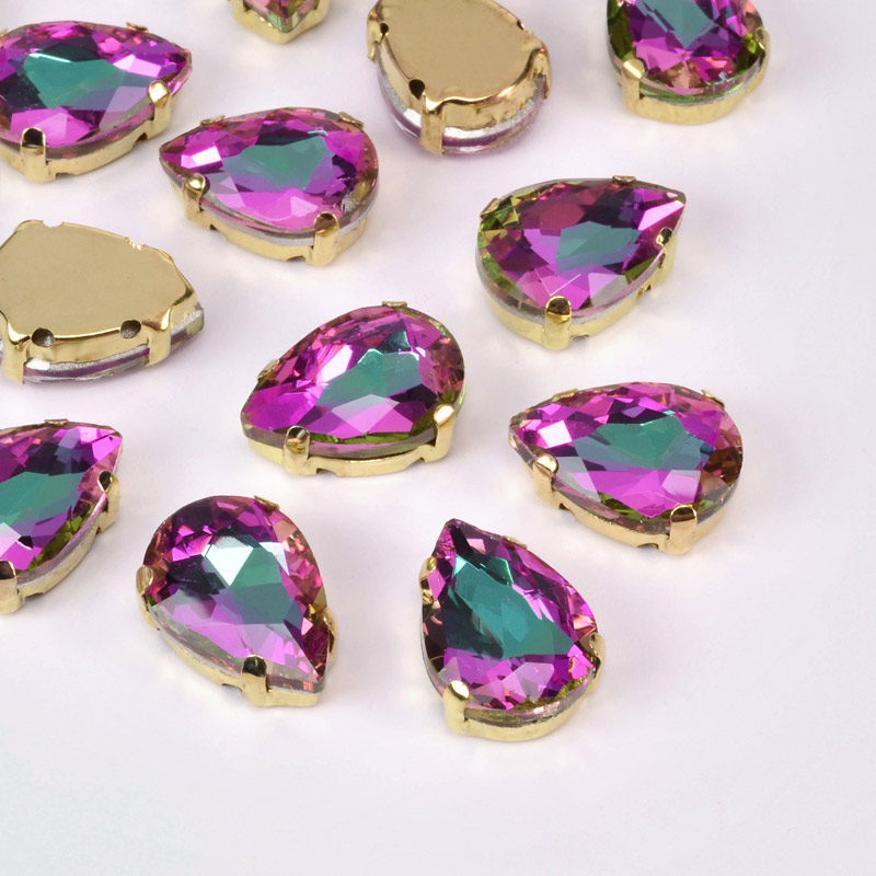 Шатон капля 14х10 мм, Золото, Малиново-бирюзовый (KAB-052923) / 1 шт