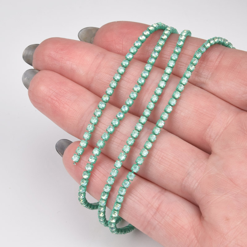Стразовая цепь SS6 - 2,0 мм, Мятная, Стразы стеклянные белые хамелеон (ZEP-061021) / 1 м